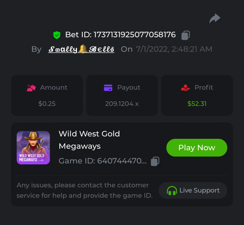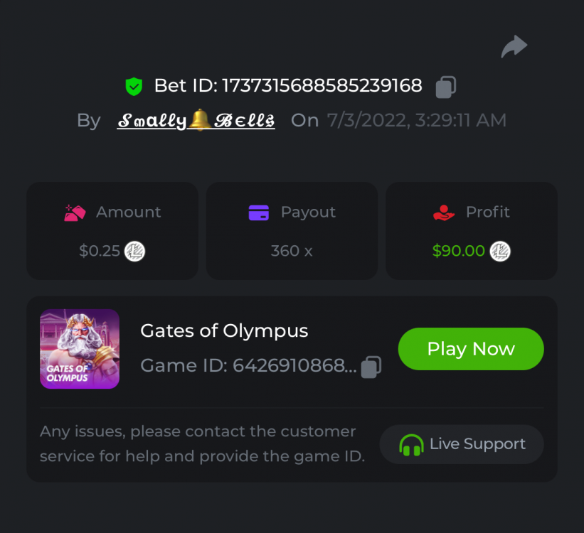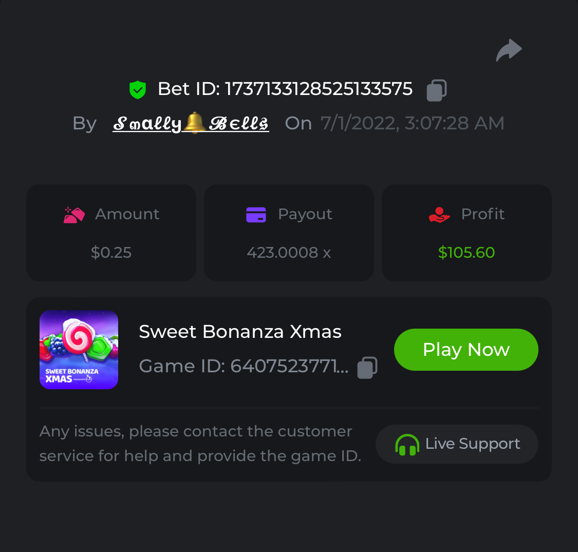 1. Sweet Bonanza: 196.44x https://hash.game/sd/?sd=10O1L1AME2AO0J Gates of Olympus: 360x https://hash.game/sd/?sd=10NXINXXM5HPUB Big Bass Bonanza: 272.5x https://hash.game/sd/?sd=10NXGKI8MBUBYR Wild West Gold Megaways: 209.12x https://hash.game/sd/?sd=10NSHRFA3IZXG3 Bigger Bass Bonanza: 636.5x https://hash.game/sd/?sd=10O4IBZ1B94M4Z Sweet Bonanza Xmas: 423x https://hash.game/sd/?sd=10NSIW1H25RBBN Starlight Princess: 285.36x https://hash.game/sd/?sd=10NSBCSCJUJAJ7 Dog House Megaways: 415x https://hash.game/sd/?sd=10NTX8PH8UUHHV It doesn't matter for anything but just FYI in case it's reused - the prize pool table pic says "4rd place" lol Bounty: 50x (idk why its .0001x - LTC fluctuations maybe...was a $5.00 win on a $0.10 bet though) https://hash.game/sd/?sd=10NXOMAF8XVF2R