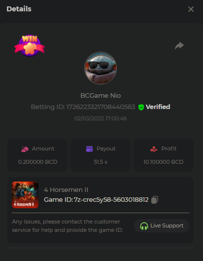 $2k Prestige Keno Challenge #22 ⚿ Greetings VIPs! This week we have KENO Challenge, with a total prize pool of $2000. The top 10 players who hit the unique payouts on Keno or Keno Multiplier will receive the major prize, in addition, each eligible entry will also get a share from the pool – Check out below the requirements. What's the Challenge? Complete as many of the following 20 payouts on either KENO or KENO Multiplayer. Must be a exact muliplier. | 5.10x | 11x | 17x | 26x | 30x | 56x | 63x | 81.5x | 100x | 180x | 250x | 270x | 350x | 450x | 500x | 600x | 710x | 800x | 900x - 1000x | Each payout you hit above counts as 1 point (Maximum 1 point for each payout). If there is a tie, the player with the higher average bet amount (in USD) shall be the winner. Minimum VIP There's no minimum VIP level Minimum Payouts Hit at least 3 payouts to qualify Minimum Bet Size $0.10 USD equivalent Eligible Coins All cryptocurrencies are eligible (excepting JB, and BCL) Available Prizes 1st Place....... $500 2nd Place..... $300 3rd Place...... $200 4th Place......$100 5th Place......$50 6th-10th.........$30 The remaining $700 will be split between all other players who reach the minimum target multiplier, min bet and minimum VIP. How to Enter To enter, copy the link of the bet you'd like to submit. Once you've copied it, paste it as a reply to this thread like so: Link: https://bc.game/sd/?sd=10GT450UX7SN4J In the same post, upload a screenshot of your win by clicking the game ID WITH VIEW IN USD mode ENABLED (accessible at the bottom of dropdown menu for your wallet up top. This way, we can ensure that your bet indeed met the minimum requirement at the time of placing it: Link: https://bc.game/sd/?sd=10GT450UX7SN4J Please combine all of your hits together in a SINGLE post. Edit your existing post for additional hits, don't create a new post. Bets must be posted within 24 hours of placing bet in order to keep things fair for everyone. Bets must be made during the specified time window stated above. This thread will lock automatically when the time period is over. One (1) entry per household. Anyone found attempting to win multiple prizes will be disqualified from this challenge as well as all future challenges. Failure to follow instructions will result in your submission being null and void. By entering this challenge, you acknowledge that BC.Game has the final decision on results and placement. Payouts will be made within 72 hours of challenge completion, please be patient, we promise you that we haven't forgotten. We check and double check to make sure the rightful winners receive their prize. Prizes will be paid out in BCD. Good luck to everybody!
